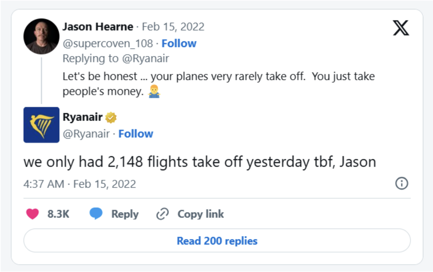 Ryanair is a budget airline known for cheap flights, extra fees, and questionable amounts of legroom. Instead of defending their brand, they leaned into it. Their voice is petty and painfully self-aware. When someone tweets about the airline’s tiny seats or poor baggage fees, Ryanair replies with something like, “It’s because you only paid $17 for this flight.”